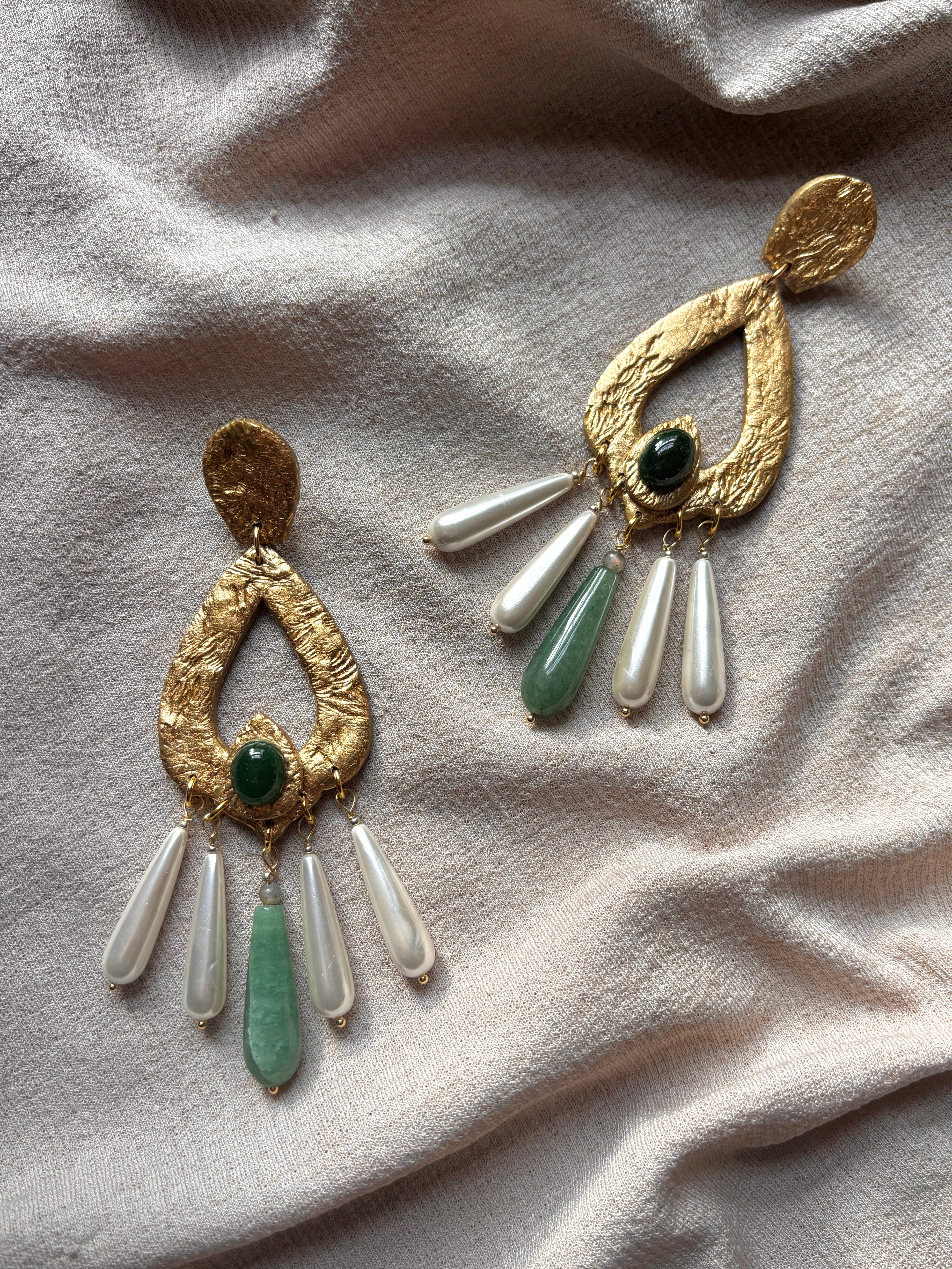 Made from polymer clay, Ava and Azar statement earrings are incredibly light - this pair have an antique gold clay base, along with semi-precious green Aventurine stones, pearl teardrop beads and distressed gold leaf.