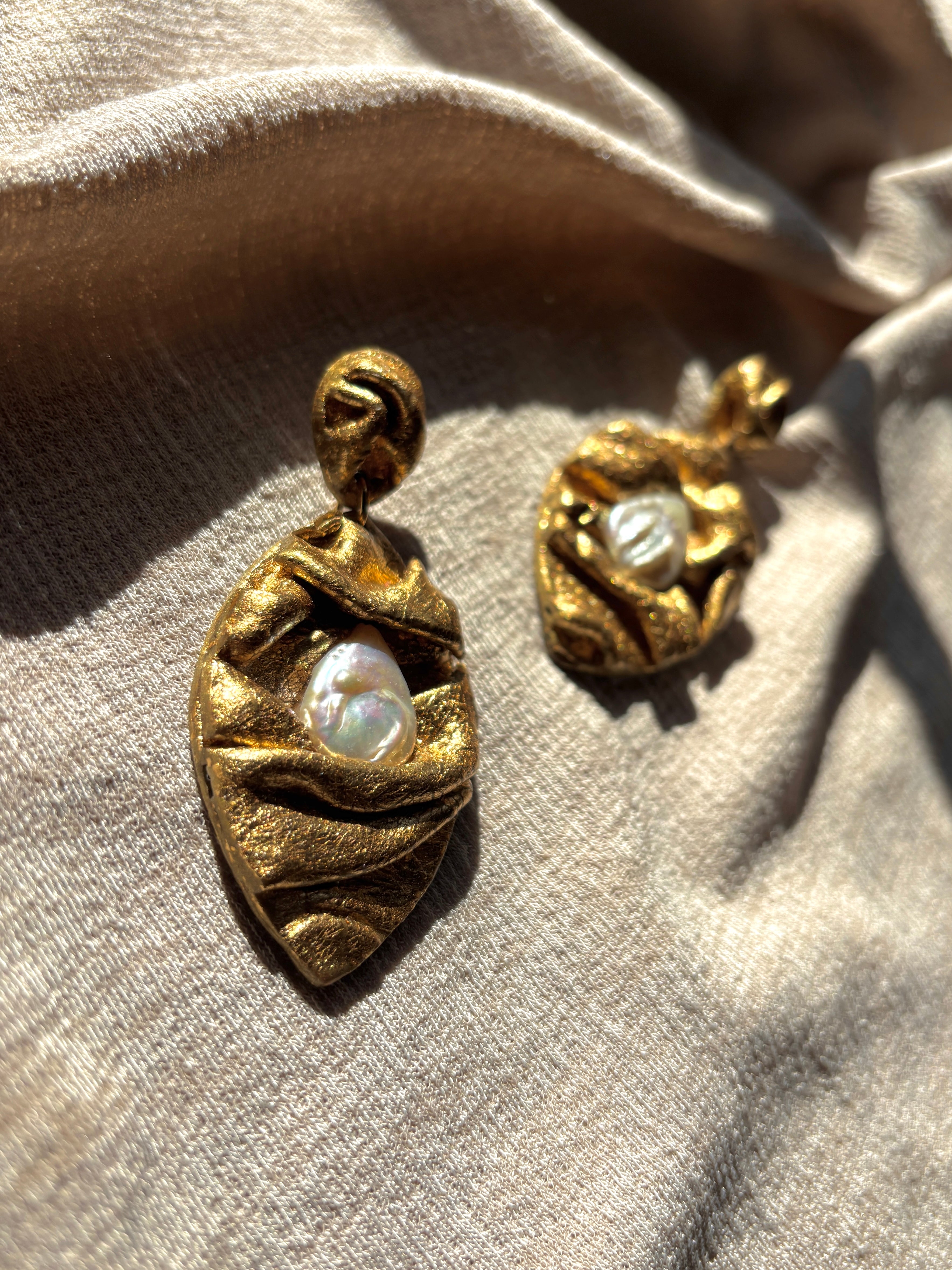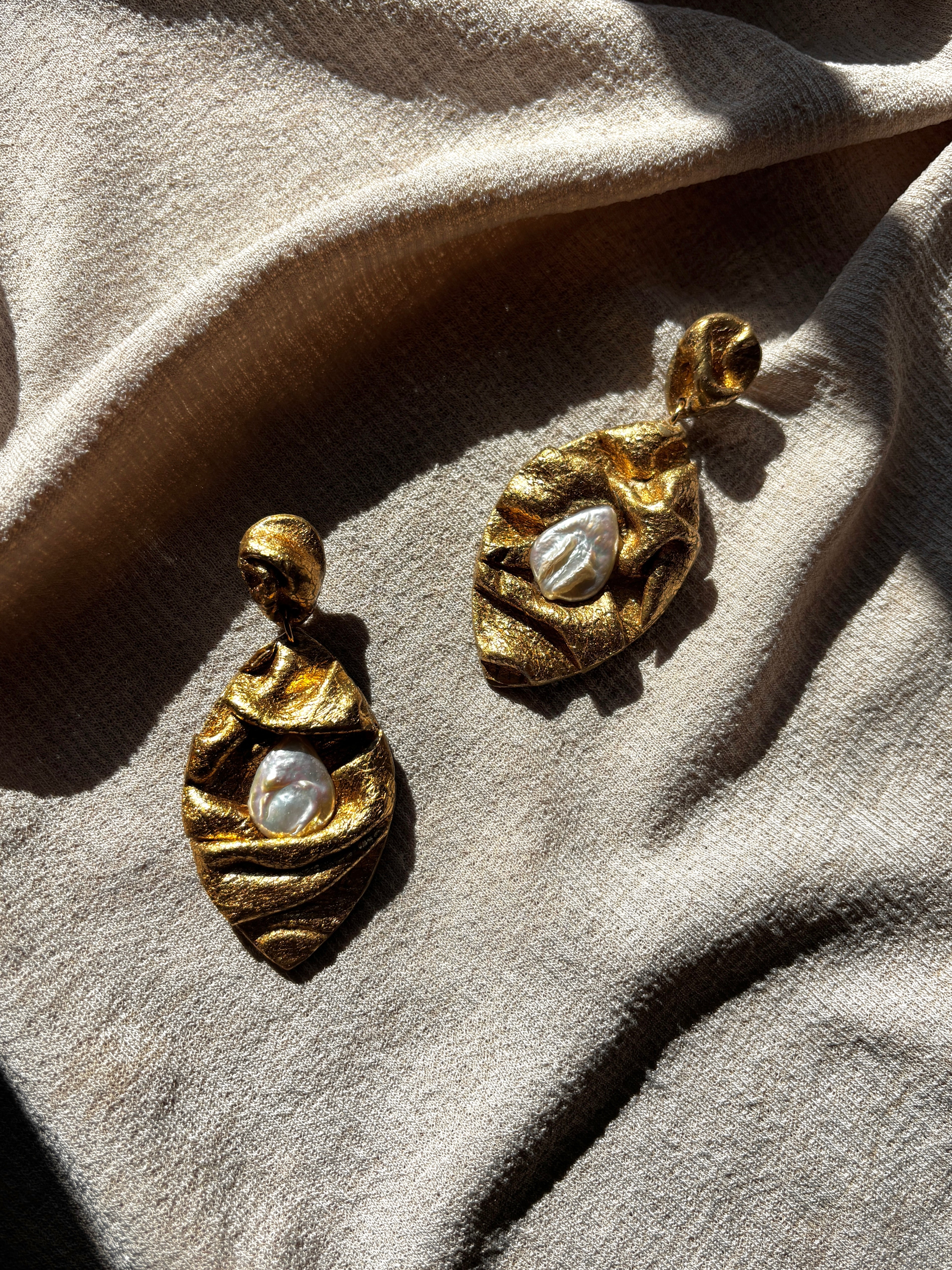 With an antique gold clay base, this Ava and Azar slow-made feather style are finished with gold leaf, a warm golden shimmer and freshwater pearls - this handcrafted draped texture-effect pair have a slightly textured and distressed finish.