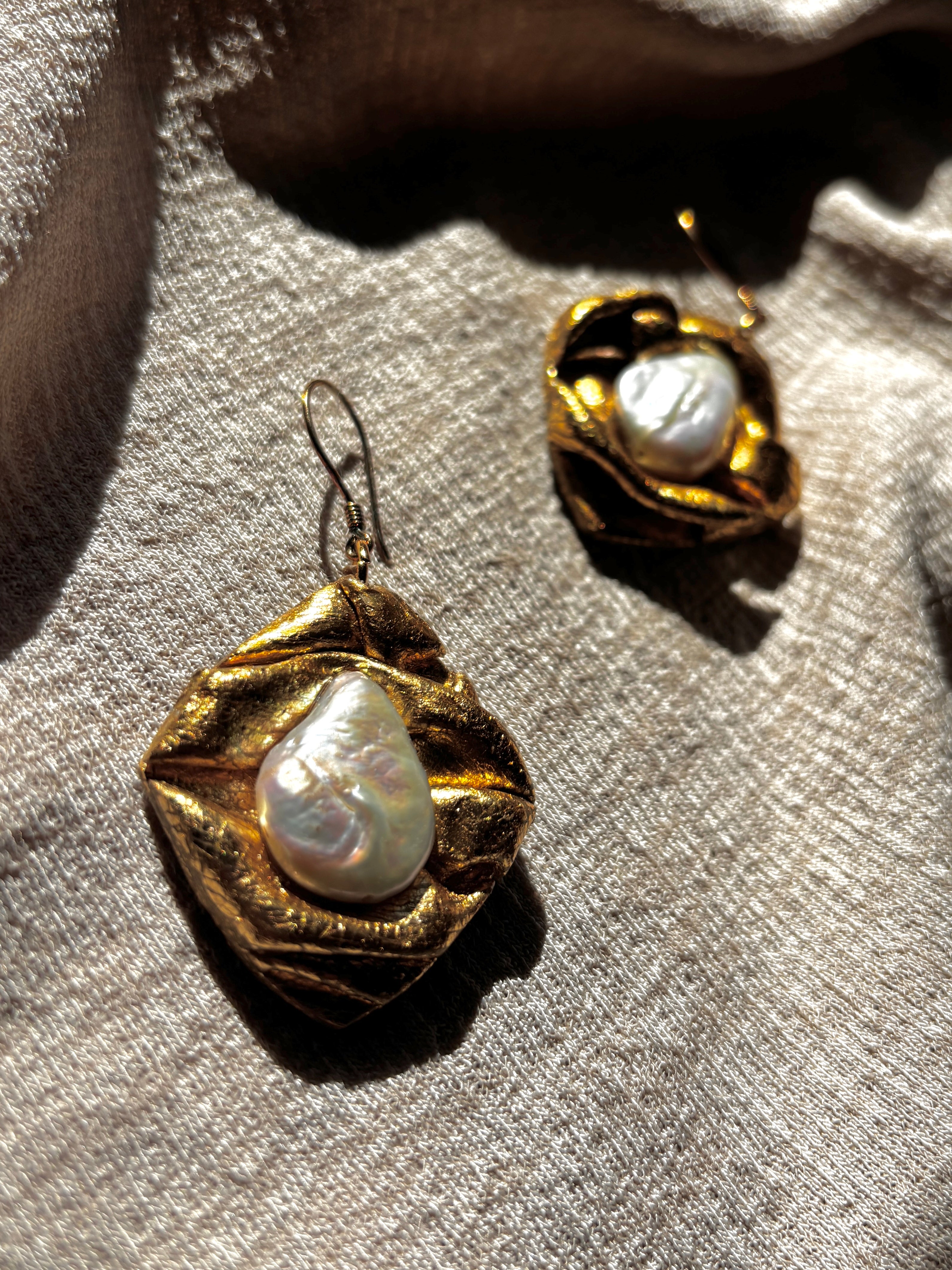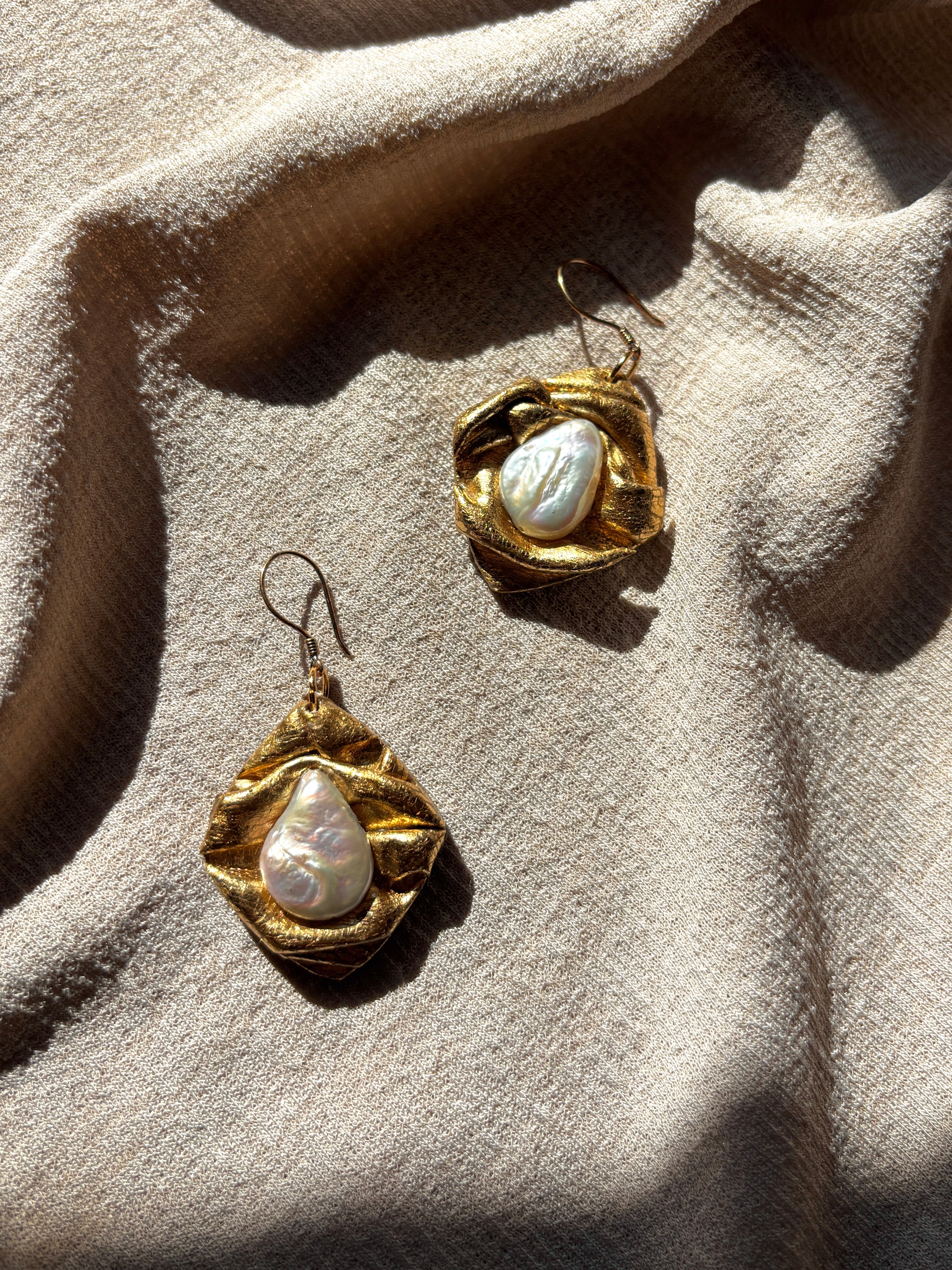 This unique diamond-shaped statement pair are incredibly lightweight - with freshwater pearls framed in the centre and finished with gold leaf detailing, they catch the light beautifully and look graceful on the ear.