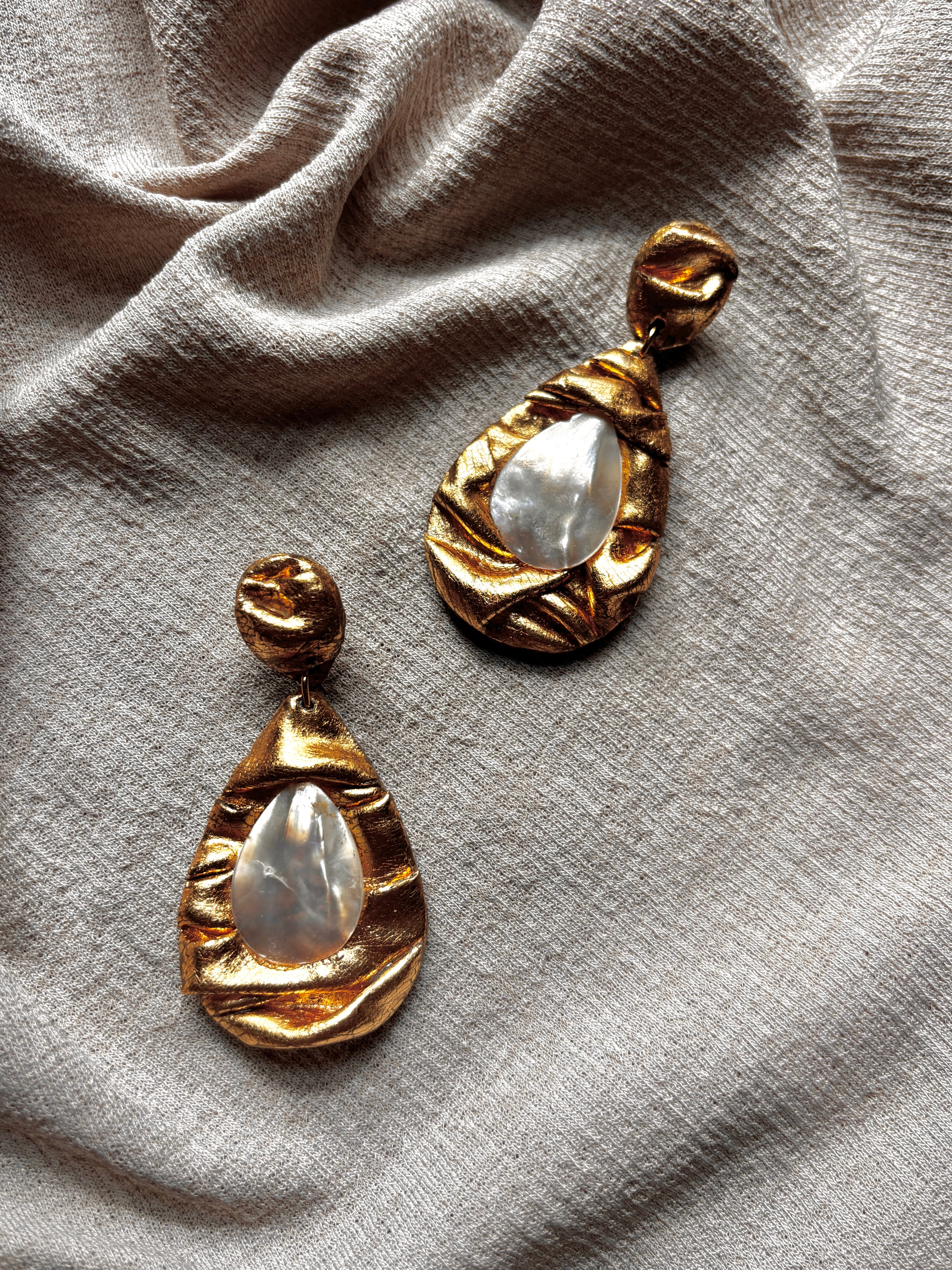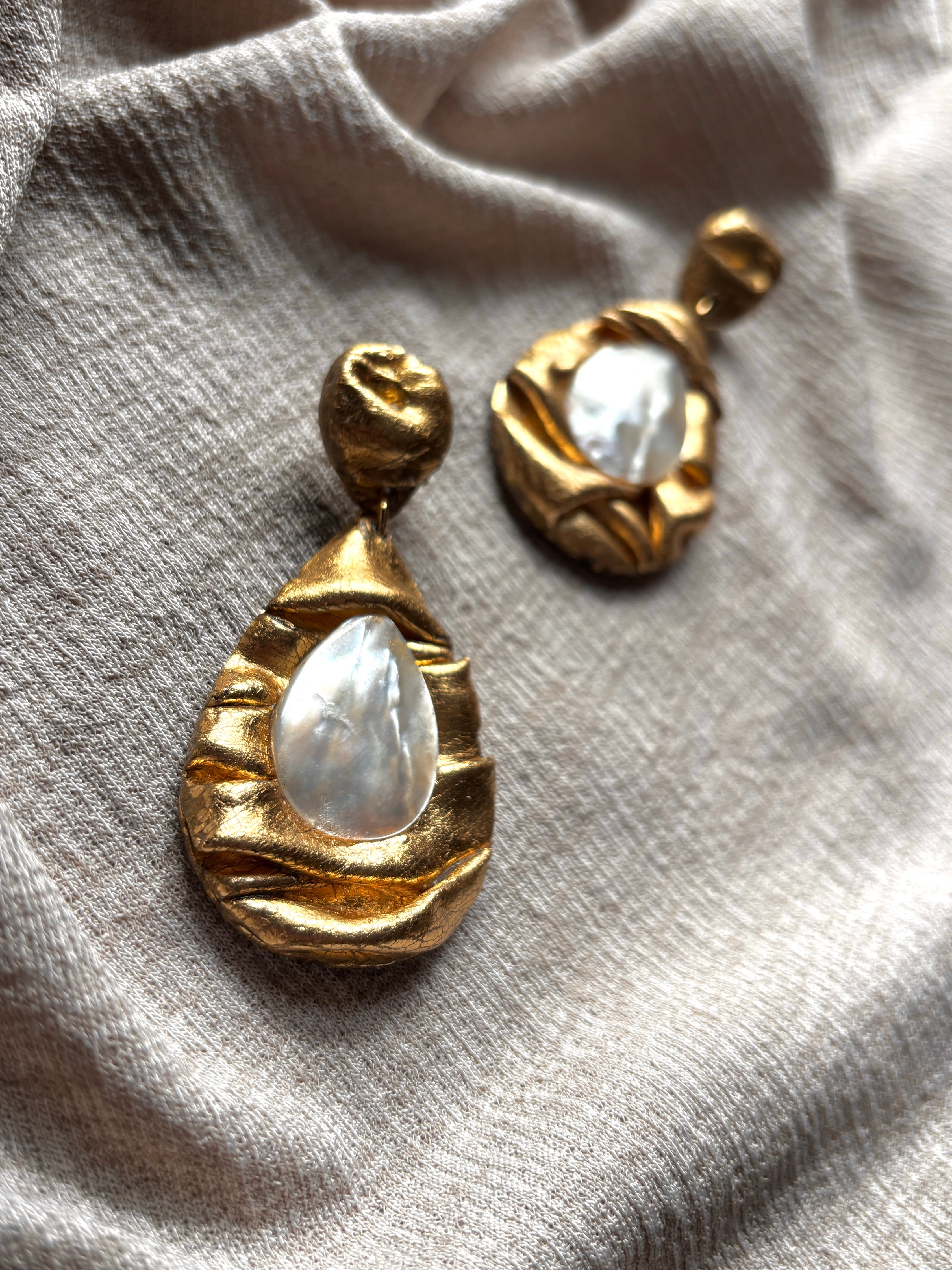 With an antique gold clay base, this Ava and Azar slow-made style are finished with gold leaf, along with freshwater pearl cabochons as the centrepiece - this handcrafted draped texture-effect pair have a slightly distressed finish.