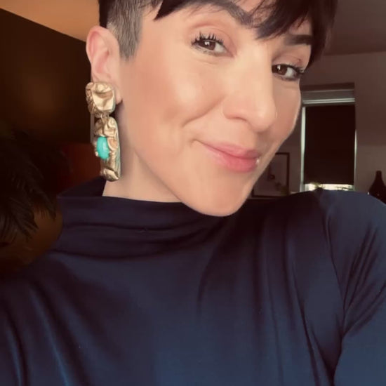 With a base clay colour of turquoise and antique gold, this beautiful Ava and Azar drop style have a handcrafted draped texture, finished with distressed gold leaf detailing and natural turquoise Howlite stones adorned in the centre.