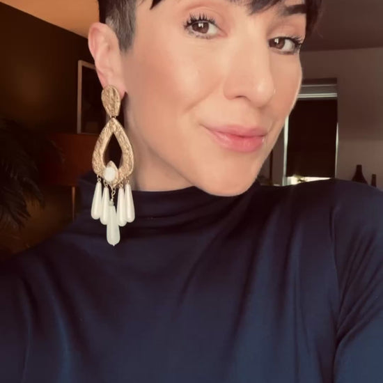 Made from polymer clay, Ava and Azar statement earrings are incredibly light - this pair have an antique gold clay base, along with semi-precious white Howlite and white quartz stones, pearl teardrop beads and distressed gold leaf.