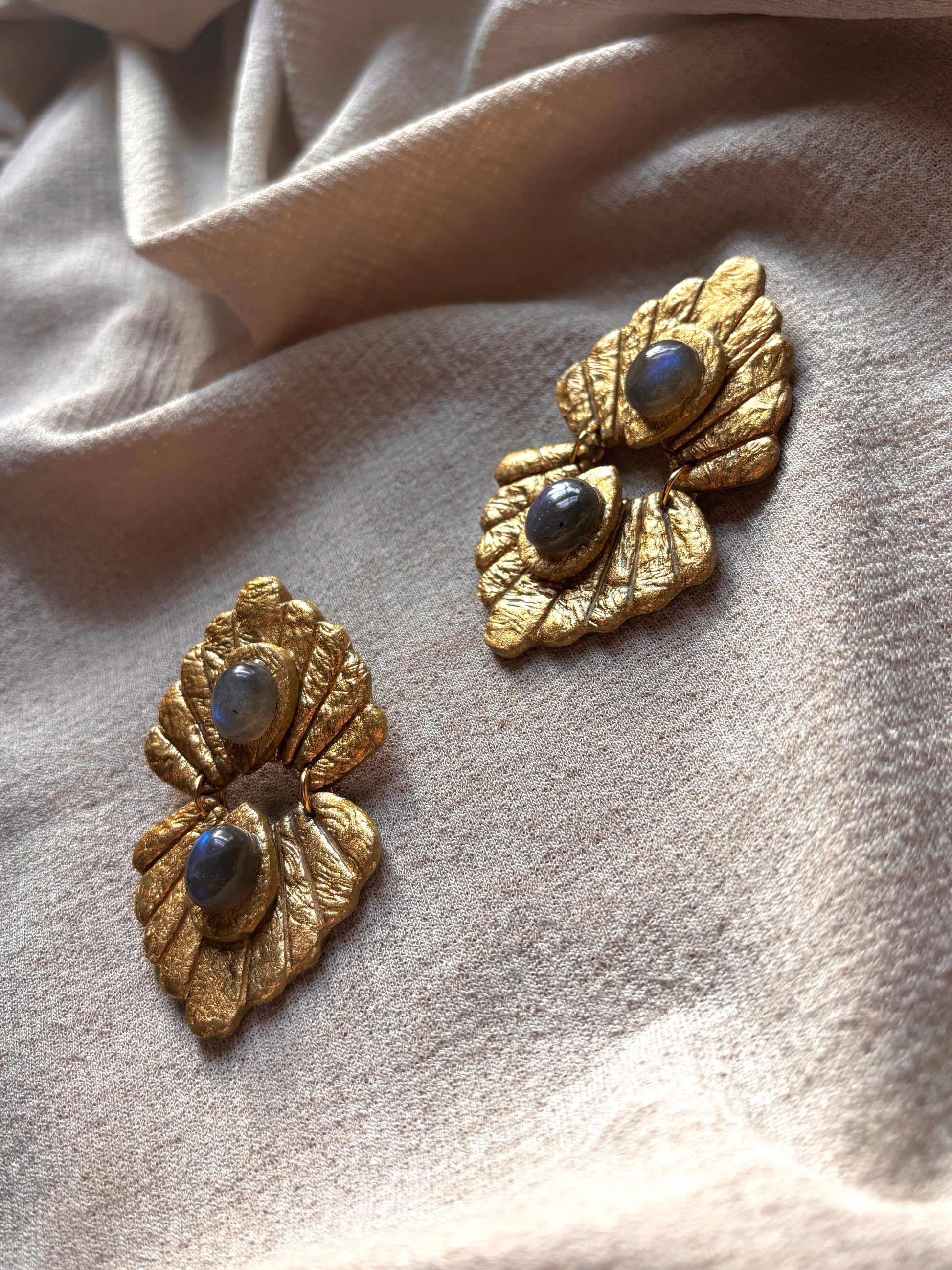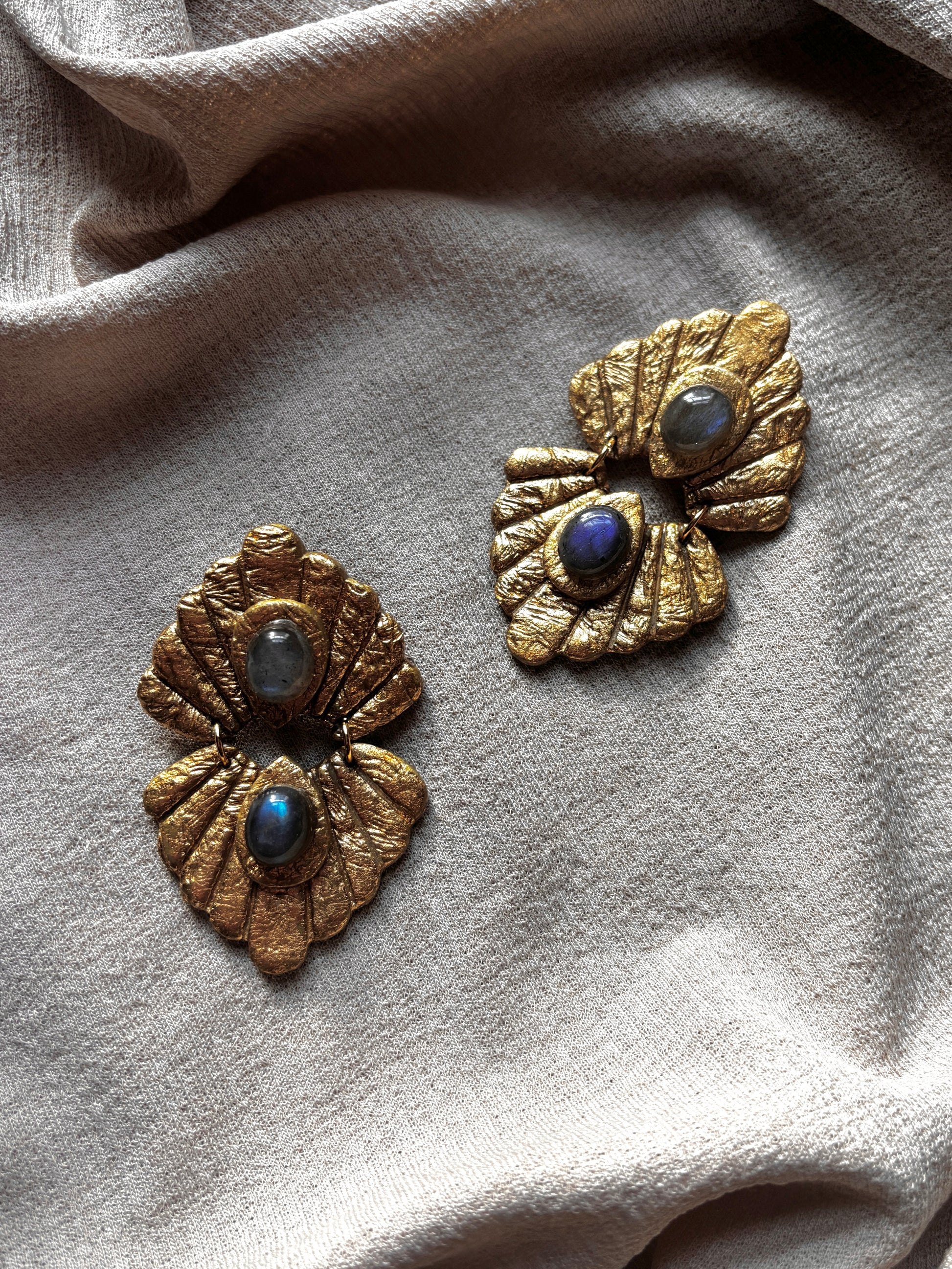 With an antique gold clay base, this vibrant Ava and Azar style are finished with gold leaf detailing on the front and semi-precious labradorite stone embellishments.