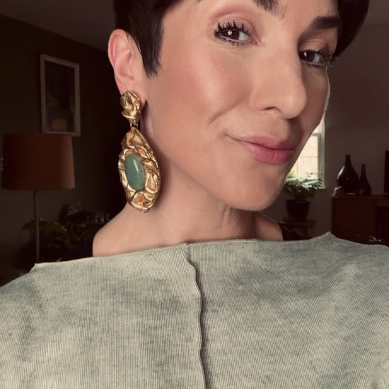 With an antique gold clay base, this Ava and Azar slow-made feather style are finished with gold leaf, a warm golden shimmer and semi-precious Green Aventurine stones - this handcrafted draped texture-effect pair have a distressed finish, made to feel like unearthed treasure.